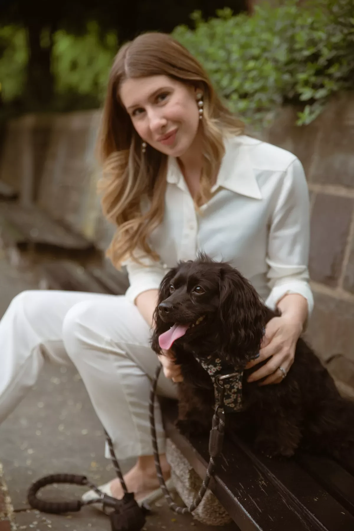 A woman with long, wavy, light brown hair sitting on a park bench holding a black cocker spaniel dog with a floral collar. The woman is smiling at the camera and wearing earrings, a white shirt, and white pants. The dog has its tongue out and is looking to the side.